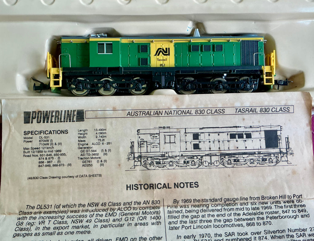 830 CLASS = 852 AN SAR-TASRAIL GREEN DC LOCOMOTIVE Powerline Model - Original with Euro couplers - un- used model in good running order, original box Pre- Owned model HO.