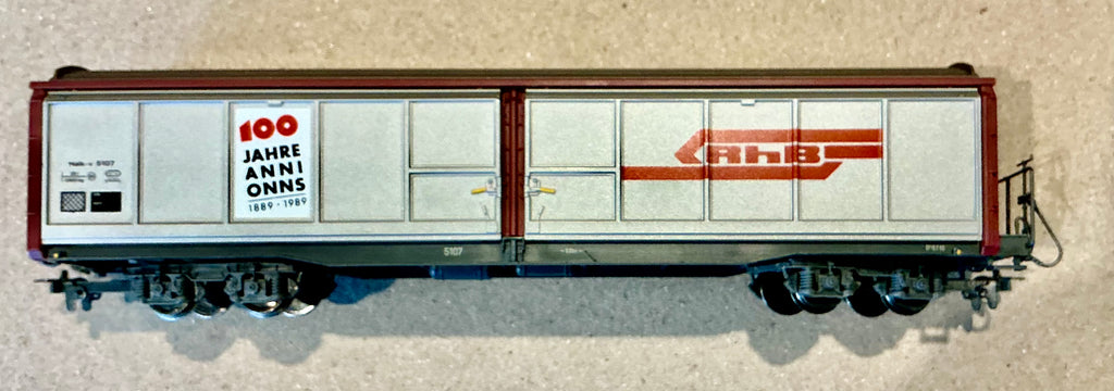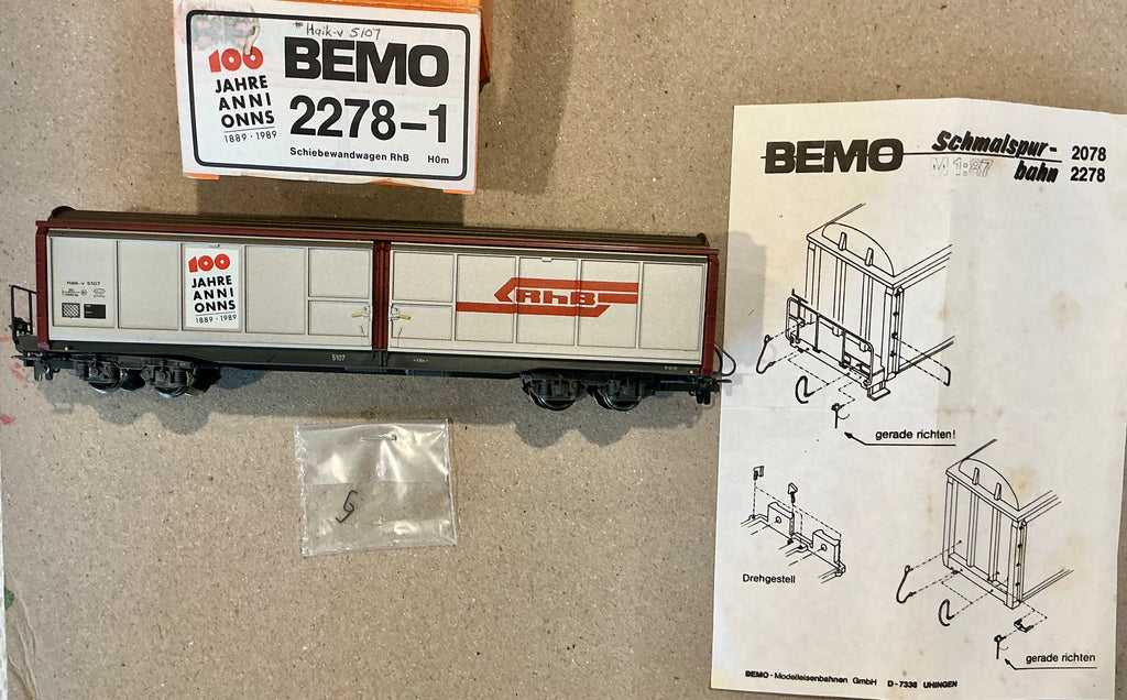 The BEMO H0m 12mm 2278-1 is a model of a RhB Schiebewandwagen (sliding wall wagon), specifically part of the "Haik" type four-axle closed freight cars used by the Rhaetian Railway (RhB). which run on 12mm track