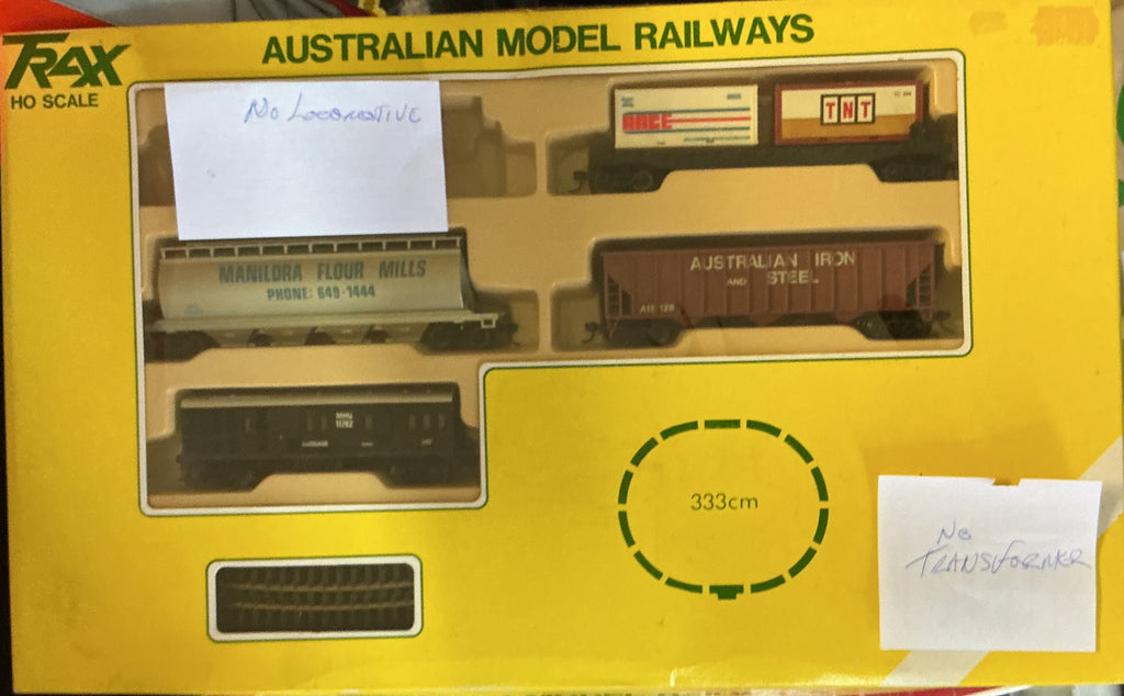 TRAX AUSTRALIAN MODEL RAILWAYS TRAIN SET an ORIGINAL boxed set without locomotive or transformer wagons with metal wheels, KADEE couplers, very good condition - 2nd hand